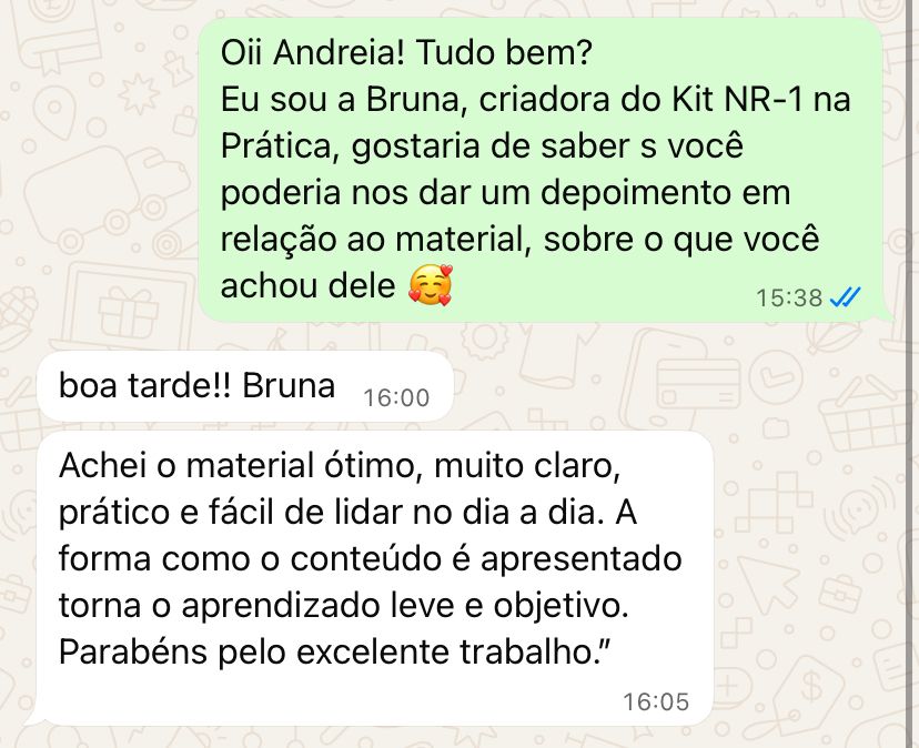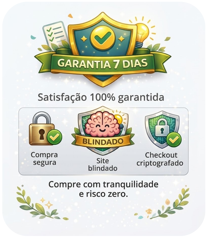 Queremos que você se sinta totalmente seguro ao adquirir o NR1 na Prática — Kit de Saúde Mental no Trabalho. Por isso, oferecemos garantia de satisfação total. Se dentro do prazo de 7 dias você entender que o kit não é adequado para a sua realidade, basta solicitar o reembolso.